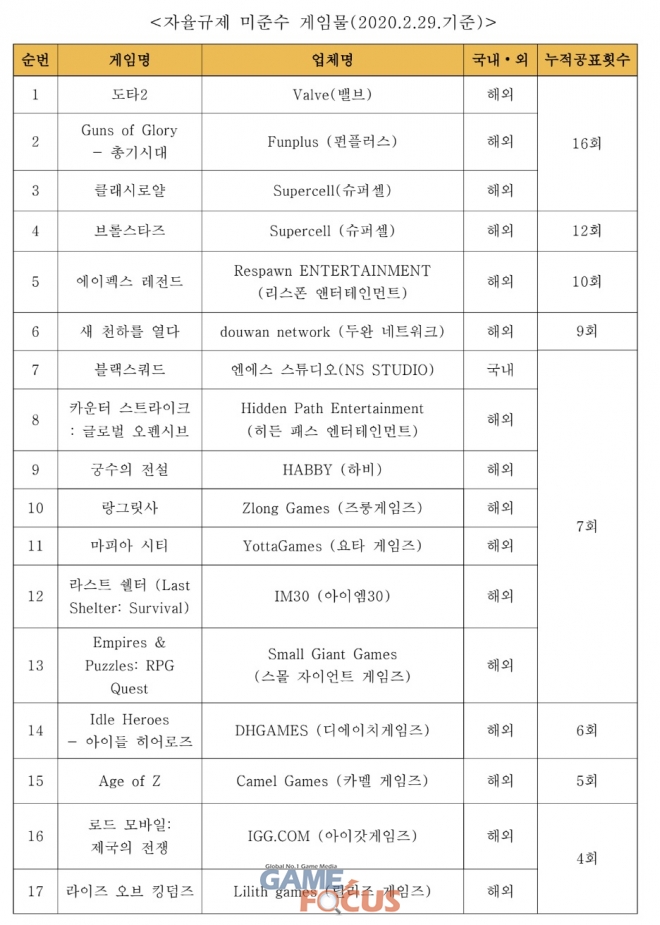 한국게임정책자율기구(이하 ‘기구’)는 한국게임산업협회(이하 ‘협회’)에서 시행하고 있는 강화된 '건강한 게임문화 조성을 위한 자율규제 강령(이하 ‘강령’)'에 따라 미준수 게임물을 2020년 3월 16일 16차 공표하였다.
