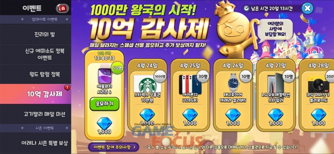 지난 6일 출시 두 달 반 만에 글로벌 누적 1000만 다운로드를 달성한 쿠키런: 킹덤은 유저들의 사랑과 성원에 보답하고자, 4월 23일부터 5월 13일까지 총 10억원 상당의 경품을 제공하는 감사제를 진행한다. ▲태그호이어 시계 ▲아이폰12 ▲비스포크 냉장고 ▲QLED TV ▲스타일러 ▲제네바 스피커 ▲생로랑 백 ▲스타벅스 상품권 ▲쿠키런: 킹덤 게임 아이템 등 다양한 경품이 풍성하게 마련되어 있다.