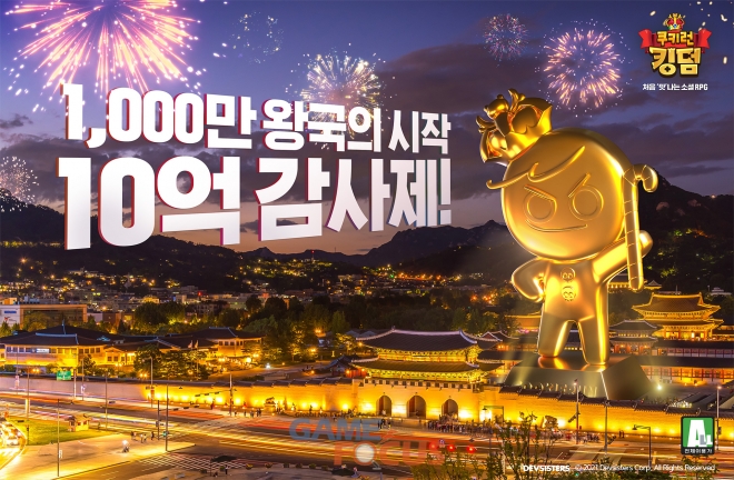 데브시스터즈(공동대표 이지훈, 김종흔)가 자사에서 서비스하고 개발 스튜디오 데브시스터즈 킹덤(공동대표 조길현, 이은지)에서 개발한 모바일 RPG '쿠키런: 킹덤'의 글로벌 누적 1,000만 다운로드 돌파를 기념해 '10억 감사제'를 실시한다.