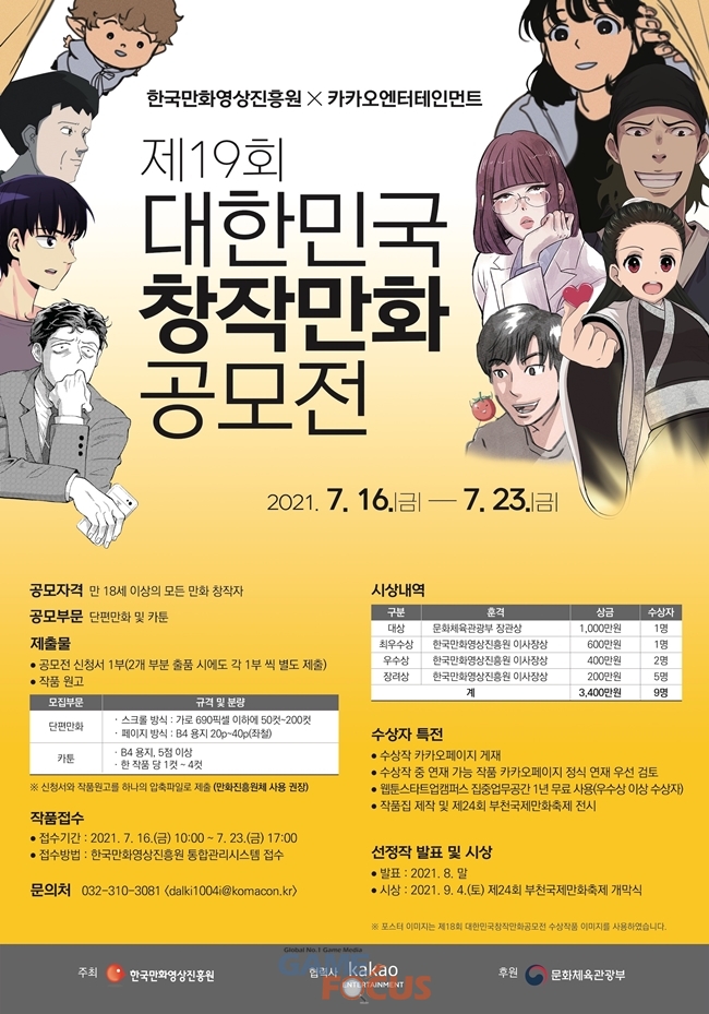 문화체육관광부와 한국만화영상진흥원에서 주최하는 '제19회 대한민국창작만화공모전'에 카카오엔터테인먼트가 협력사로 참여, 수상작에는 카카오페이지 작품 게재 및 웹툰 우선 연재 기회를 제공한다.