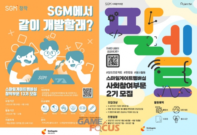 스마일게이트 희망스튜디오(이사장 권혁빈)가 게임 및 엔터테인먼트 분야에 열정을 가진 청년들이 창작자로 성장하고, 지역사회 창의 환경을 함께 확산하고자 하는 대학생 봉사활동 팀을 지원하는 프로그램인 ‘스마일게이트멤버십(이하 SGM)’을 창작/AI/사회참여 등 3개 분야로 나눠 모집한다고 31일(월) 밝혔다.
