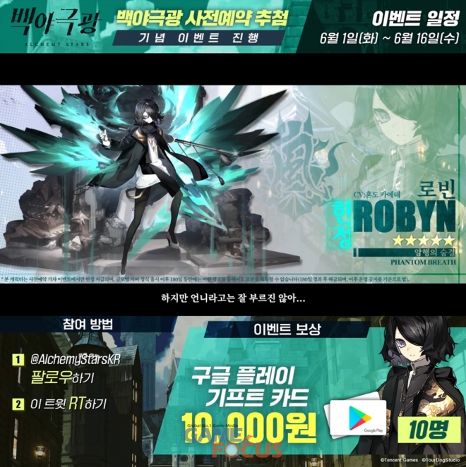 이번 사전예약 추첨 이벤트는 6월 16일 밤 9시까지 진행되며, 출시와 함께 사용할 수 있는 캐릭터 1종을 무작위로 선물하는 프로모션으로, 사전예약을 하고 페이스북과 트위터 아이디가 있으면 누구나 별도의 이벤트 페이지에서 참여할 수 있다.