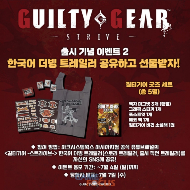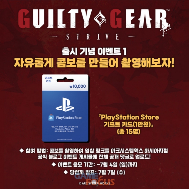아크시스템웍스 아시아지점은 현재 '길티기어 -스트라이브-'의 출시를 기념하여, 자신이 사용하는 콤보 영상을 촬영하여 공유하거나, 한국어 음성 더빙 트레일러 영상을 공유하여 이벤트에 참여하면, 추첨을 통해 총 20명에게 사은품을 증정하는 이벤트를 진행 중이다. 이벤트에 대한 자세한 내용은 다음과 같다.