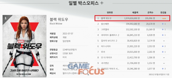 마블 스튜디오의 2021년 첫 액션 블록버스터 '블랙 위도우'가 개봉과 함께 박스오피스 1위를 차지했다. 영진위 통합전산망에 따르면 '블랙 위도우'는 개봉 첫날(7일) 195,996명의 관객을 동원했다. 이는 작년 개봉해 200만 관객을 동원한 '테넷'의 오프닝 스코어인 137,740를 뛰어넘으며 화제를 모으고 있다.