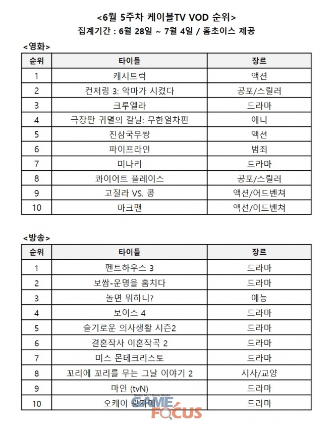 (주)홈초이스가 발표한 LG헬로비전, Btv 케이블, 딜라이브, CMB, 현대HCN 등 전국 케이블TV '6월 5주차 영화 · 방송 VOD 순위'에 따르면, '캐시트럭'이 새롭게 1위를 달성했다.