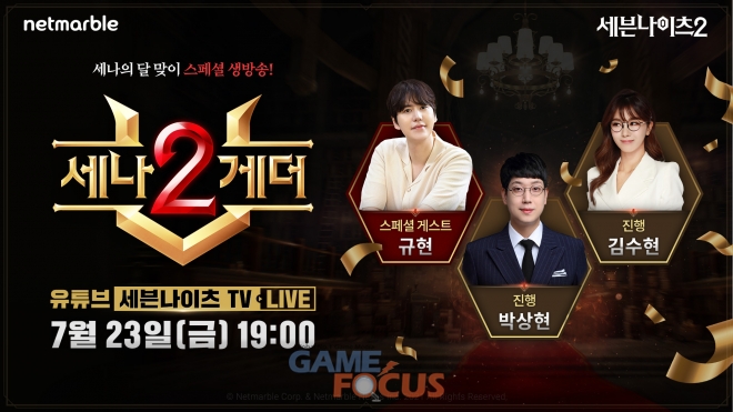 넷마블(대표 권영식, 이승원)은 모바일 MMORPG <세븐나이츠2>(개발사 넷마블넥서스)에서 7월 '세븐나이츠의 달'을 맞아 스페셜 방송 '세나2게더'를 7월 23일 오후 7시 유튜브 '세븐나이츠TV'를 통해 실시간으로 진행한다고 밝혔다.