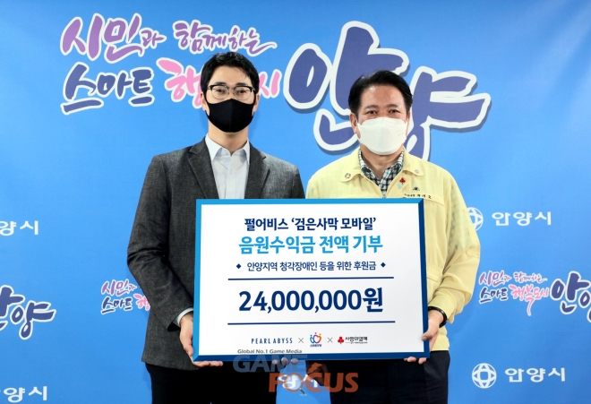 펄어비스(대표 정경인)가 경기도 안양시에 검은사막 모바일 '격투가X질풍가도'와 '모험가(歌)' 콜라보 음원 수익금 2,400만원을 전달했다.