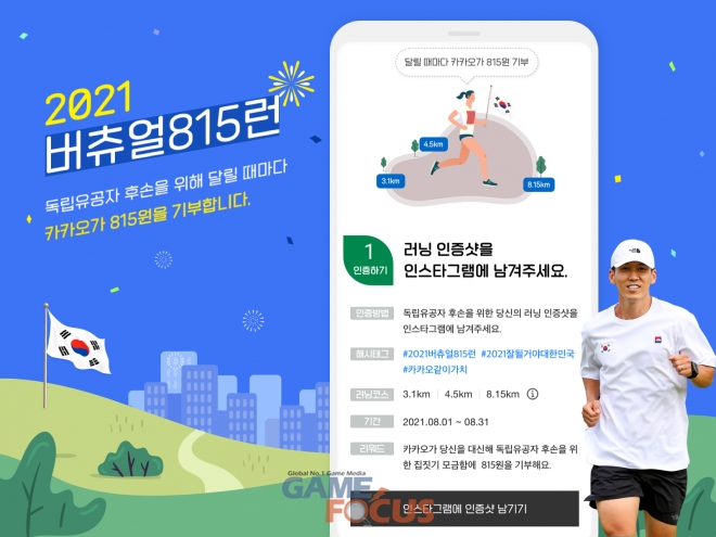 카카오(공동대표 여민수, 조수용)의 사회공헌 플랫폼 카카오같이가치가 광복 76주년을 맞아 이달 31일까지 ‘2021 버츄얼 815런’ 인스타그램 인증 기부 캠페인을 진행한다.
