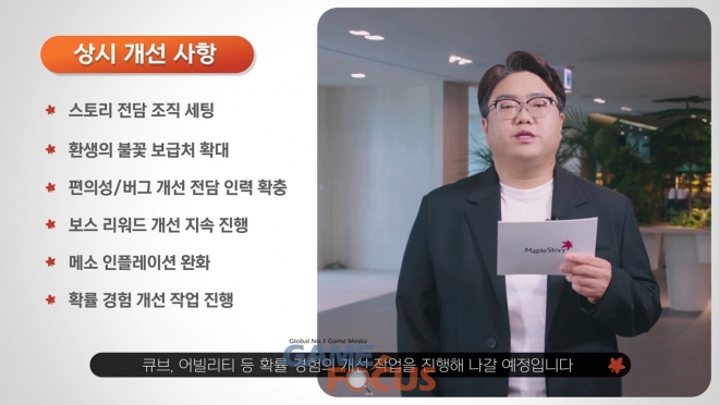 이 외에도 스토리 전담 조직을 세팅하고 편의성·버그 개선 전담 인력을 확충해 게임 내 콘텐츠를 개편하는 속도를 높인다. 큐브와 어빌리티 등 확률형 시스템에 대한 유저 경험을 보완하는 작업 또한 상시적으로 진행할 예정이며, 캐릭터 육성 경험이나 길라잡이 미션 개편, 제로 캐릭터 생성제한 해제 같은 사항들도 모두 연내 적용하겠다는 계획이다.