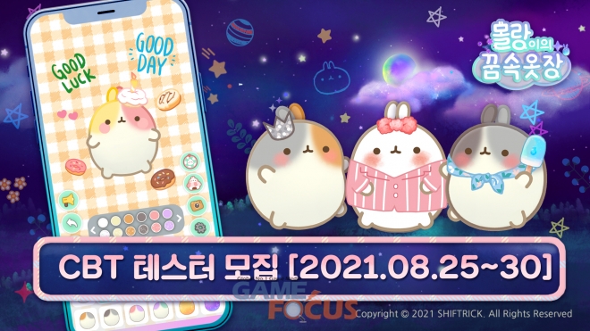 ㈜시프트릭(대표 최경연)은 인기 캐릭터 IP ‘몰랑(Molang)’을 모바일 게임화한 ‘몰랑이의 꿈속 옷장’ 의 비공개 테스트(CBT) 참가자를 모집한다고 25일(수) 밝혔다.