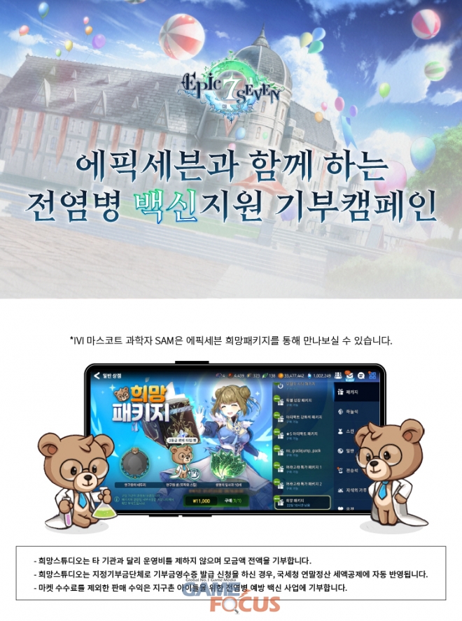 (재)스마일게이트 희망스튜디오(이사장 권혁빈, 이하 ‘희망스튜디오’)는 국제백신연구소(사무총장 제롬 김, International Vaccine Institute, 이하 “IVI”)와 함께 ‘에픽세븐’ 게임 연계 전염병 백신지원 기부 캠페인을 실시한다고 6일 밝혔다.