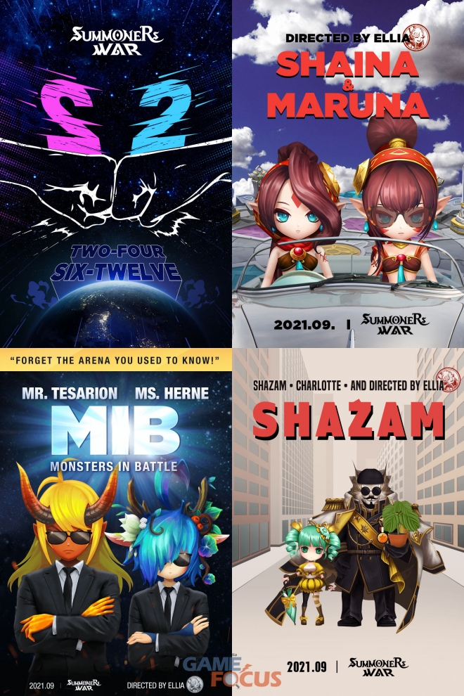 2차로 공개된 이미지는 서머너즈 워 속 몬스터들을 활용해 구성됐다. 특히 3종의 이미지가 모두 2명의 주인공 케미가 돋보이는 영화를 패러디한 점이 눈에 띈다. 서머너즈 워 인기 몬스터인 ‘차크람 무녀’와 ‘부메랑 전사’는 90년대의 한 유명 영화 속에서 일탈과 모험을 찾아 떠나는 여성 주인공들로 변모했으며,