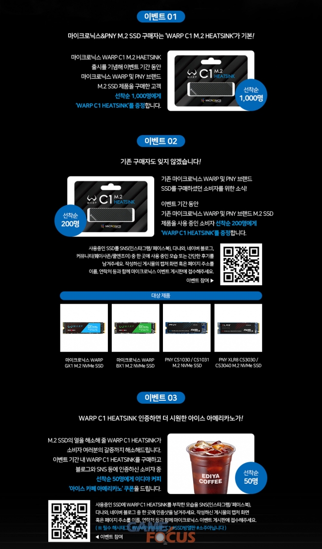 기존 제품을 구매한 소비자를 대상으로 한 이벤트도 함께 진행한다. 이벤트 기간 내에 사용 중인 마이크로닉스 WARP 및 PNY SSD를 소셜네트워크 서비스(SNS)와 블로그, 커뮤니티 등에 간단 후기 형태로 등록 후 이벤트 페이지에 접수하면 선착순 200명에게 WARP C1 M.2 HEATSINK를 증정한다.