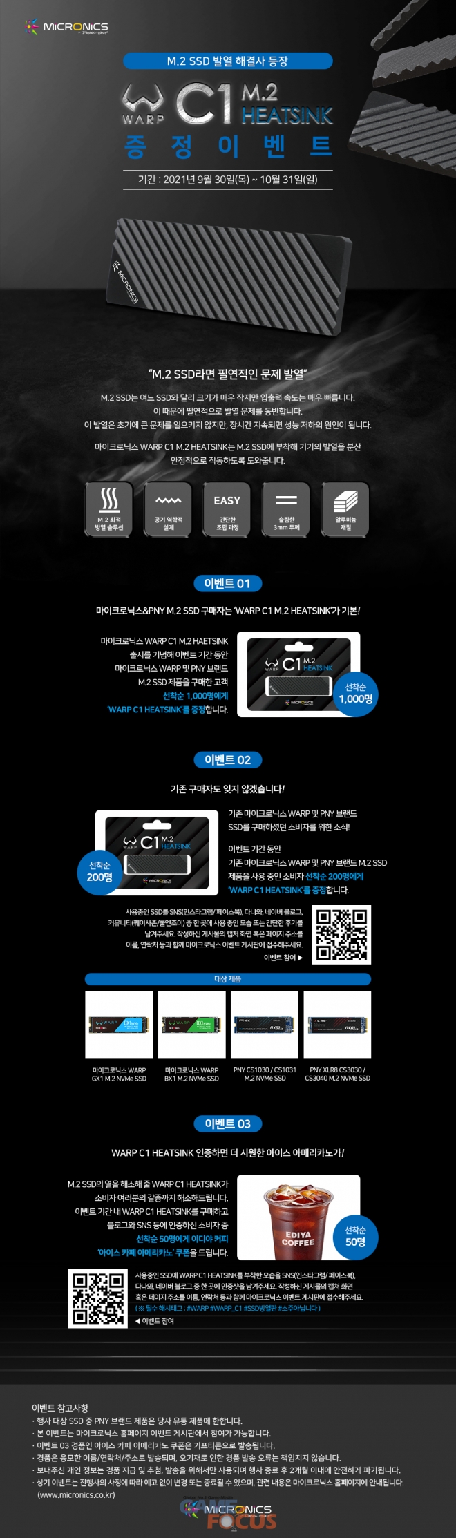 우선 마이크로닉스 WARP 및 PNY 브랜드 M.2 SSD를 구매한 소비자 선착순 1,000명에게 WARP C1 M.2 HEATSINK를 기본 제공한다. WARP BX1·GX1 및 PNY CS1030/1031, XLR8 CS3030/CS3040 등이 해당된다. 제품을 구매함과 동시에 방열판을 부착, 즉시 사용할 수 있도록 했다.
