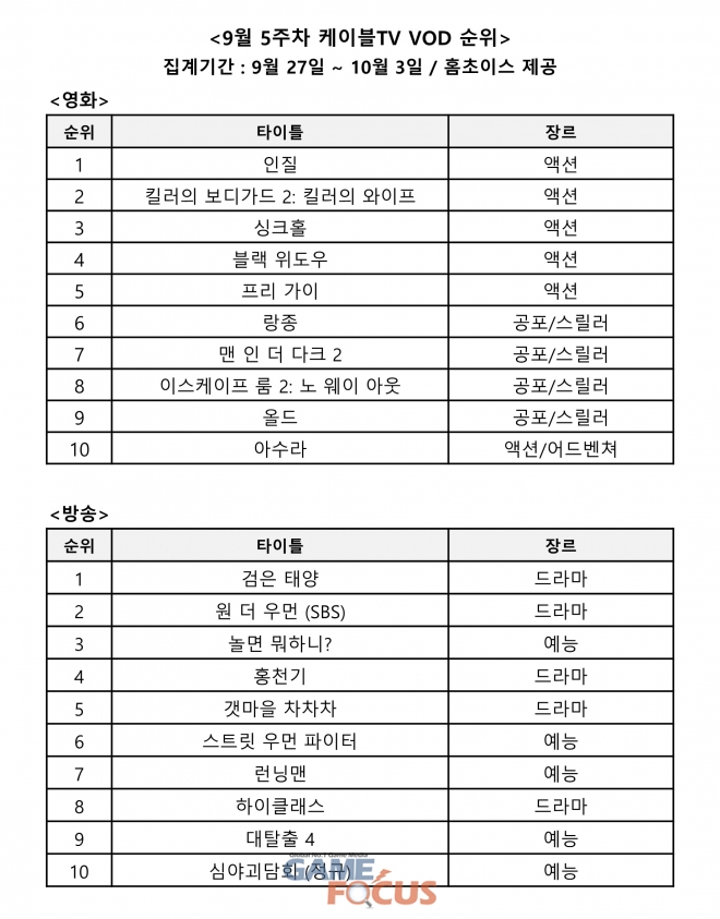 '인질'과 '검은 태양'이 각각 영화, 방송 케이블TV VOD 판매 순위 1위를 기록했다.