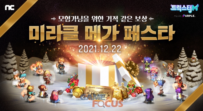 엔씨(NC)는 21일까지 '미리 메가 페스타' 이벤트를 진행한다. 22일부터 시작하는 연말 기념 '미라클 메가 페스타'의 사전 이벤트다. 이용자는 7일 동안 매일 공개되는 미션을 수행해 다양한 보상(상급 패션 소환권(이벤트) 10회 1개, 빛나는 무기 강화석 박스(귀속) 7개, 1,000,000 겔더 등)을 받는다. '미리 메가 페스타' 한정 코스튬(Costume) '크리스마스 망토'도 참여 보상으로 얻을 수 있다.
