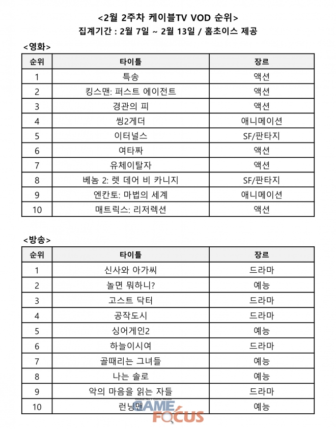 '특송'과 '신사와 아가씨'가 각각 영화, 방송 케이블TV VOD 순위 1위를 기록했다.