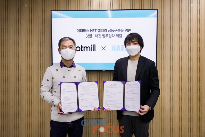 모바일게임 기업 해긴(대표 이영일)은 실감미디어 전문기업 닷밀(대표 정해운)과 메타버스 NFT 갤러리 공동구축을 위한 업무협약(MOU)를 체결했다고 21일 밝혔다.