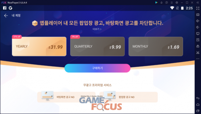 녹스 앱플레이어에서 제공된 무광고 프리미엄 서비스를 이용하면 광고 없이 깔끔한 화면에서 원하는 게임을 플레이할 수 있는 것이 가장 큰 특징이다. 녹스 메인 화면 하단 광고 아이콘 뿐만 아니라 게임 검색란, 중앙 팝업창 광고까지 깨끗이 제거하여 추천 게임및 홍보 동영상 없이 녹스 앱플레이어를 이용할 수 있다.