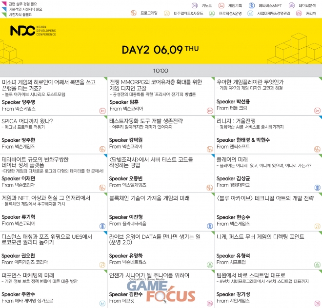 이 외에도 엔씨소프트, 에픽게임즈 코리아, 데브시스터즈, 엠바크 스튜디오, 원더피플 등 주요 게임사 종사자들이 참여해 완성도 높은 게임을 만들기 위한 최신 기술부터 게임업계 인재들의 커리어 성장을 위한 노하우까지 폭넓게 강연한다.