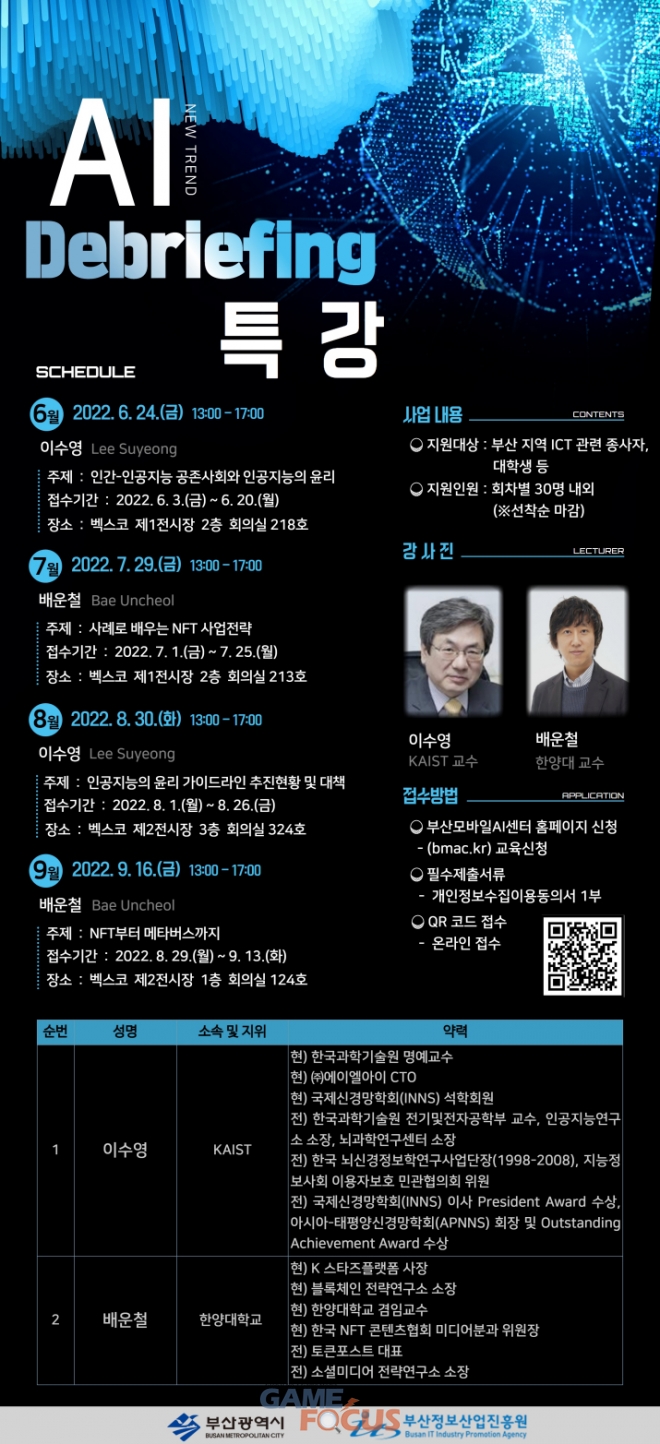 부산시(시장 박형준)과 부산정보산업진흥원(원장 정문섭)은 지역 내 ICT 관련 종사자와 지역 시민, 대학생을 대상으로 6월부터 오는 9월까지 4개월간 매월 'AI 디브리핑(Debriefing) 특강'을 벡스코에서 개최한다고 밝혔다.