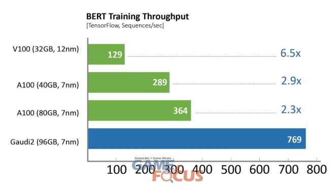 하바나 랩스는 8개의 GPU 서버 및 HLS-가우디2 레퍼런스 서버 상에서 가우디1 및 가우디2와 기존 상용 소프트웨어 간 성능을 비교했다. 학습 처리량은 NGC 및 하바나 공용 저장소의 텐서플로우 도커를 사용해 측정했으며, 제조사에서 권장하는 최고의 성능 매개 변수를 채택했다.