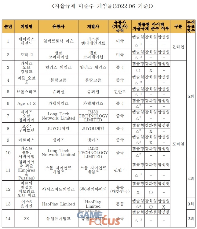 이에 따라 GSOK 내(內) 자율규제평가위원회(위원장 황성기, 이하 ‘평가위’)는 2022년 6월 기준으로 총 19종(온라인 2종, 모바일 17종)의 자율규제 미준수 게임물을 공개한다고 밝혔다.