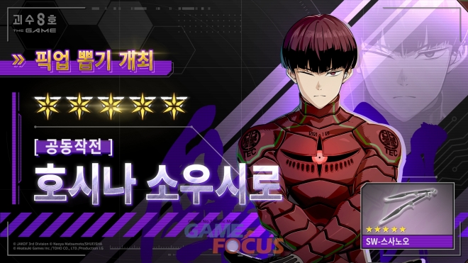 한편, 9월 20일 방영과 동시에 최단 속도로 게임에 반영된 ★5 캐릭터 [공동작전] 호시나 소우시로와 관련된 자세한 정보 및 괴수 8호 THE GAME 관련 내용은 공식 SNS 계정을 통해 확인할 수 있다.