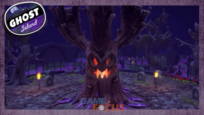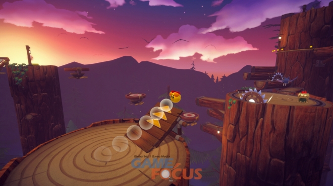 푸른 하늘에 흰 구름이 떠 있고, 야자나무와 토템폴이 늘어서 남쪽 나라를 연상시키는 풍경. 체크 무늬 땅과 절벽 등, 그린 힐의 세계관을 팩맨 월드에 재구축했다.