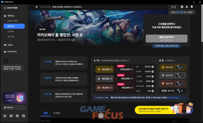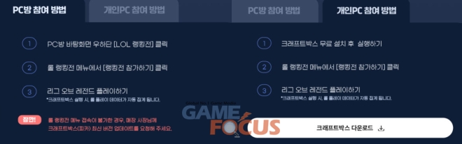 롤 랭킹전은 PC방과 개인 PC 크래프트박스를 통해 어디서나 참여할 수 있다. PC방 연동 기록이 있으면 개인전과 팀 랭킹전에 동시 참여가 가능하며, 개인 PC 크래프트박스에서도 랭킹전을 참여할 수 있는 기능이 새롭게 추가되어 접근성이 크게 향상됐다.
