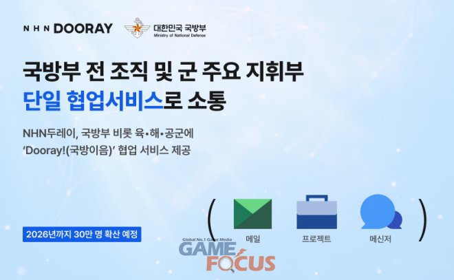 엔에이치엔 두레이(NHN Dooray, 대표 백창열, 이하 NHN두레이)는 국방부 및 육·해·공군이 추진하는 스마트 협업 서비스로 ‘Dooray!(이하 두레이)’ 도입이 진행 중이라고 15일 밝혔다. NHN두레이는 국방부·합동참모본부·3군 등 전군 30만명이 통합하여 활용할 수 있는 ‘국방이음’ 스마트 협업 체계를 단계적으로 구축할 계획이다.