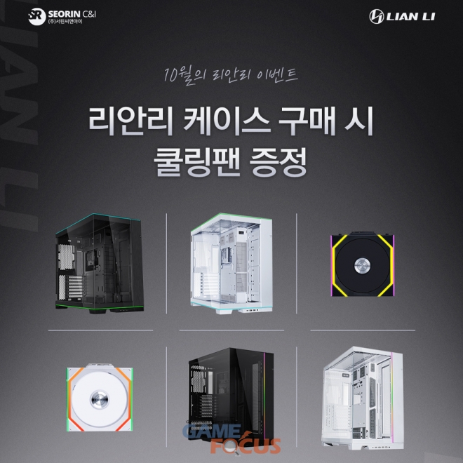 서린씨앤아이(대표: 전덕규)가 리안리(LIAN LI) PC 케이스 구매 고객을 대상으로 쿨링팬을 증정하는 10월 리안리 이벤트를 진행한다. 행사 대상은 PC-O11D EVO RGB와 PC-O11D EVO XL이며, 구매 고객에게는 케이스 색상과 동일한 UNI FAN SL WIRELESS 120 Reverse(블랙/화이트 중 1)가 사은품으로 제공된다.