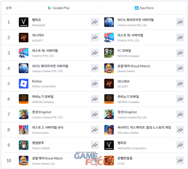 구글 플레이에서는 '뱀피르', '리니지M', '라스트 워: 서바이벌', '화이트아웃 서바이벌', '로블록스' 등이 TOP 5를 형성 중이다. '마비노기 모바일'도 이번 주 6위를 기록하며 TOP 5 재진입을 노리고 있다.