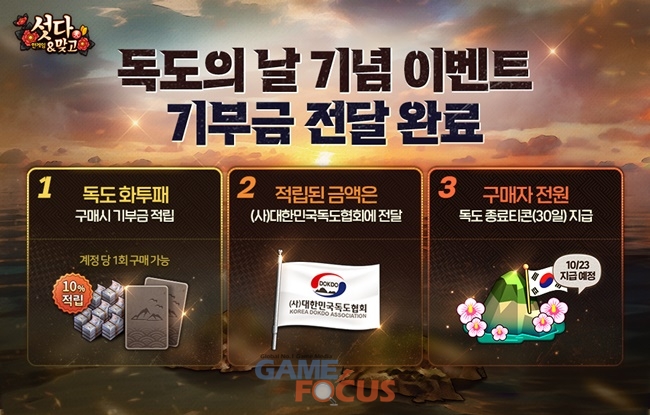 '한게임 섯다&맞고'는 독도를 상징적으로 반영한 최상위 동호회 전용 콘텐츠 '독도 수호전'과 '독도 연합 공방전'을 제공중으로, 이용자들이 게임을 즐기면서 의미 있는 활동에도 함께 참여할 수 있도록 독도 기부 이벤트를 진행했다.