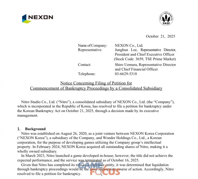 넥슨이 21일, IR 자료를 통해 연결 자회사 니트로 스튜디오의 파산 신청을 하기로 결의하고 이를 한국 법원에 제출했다고 밝혔다.