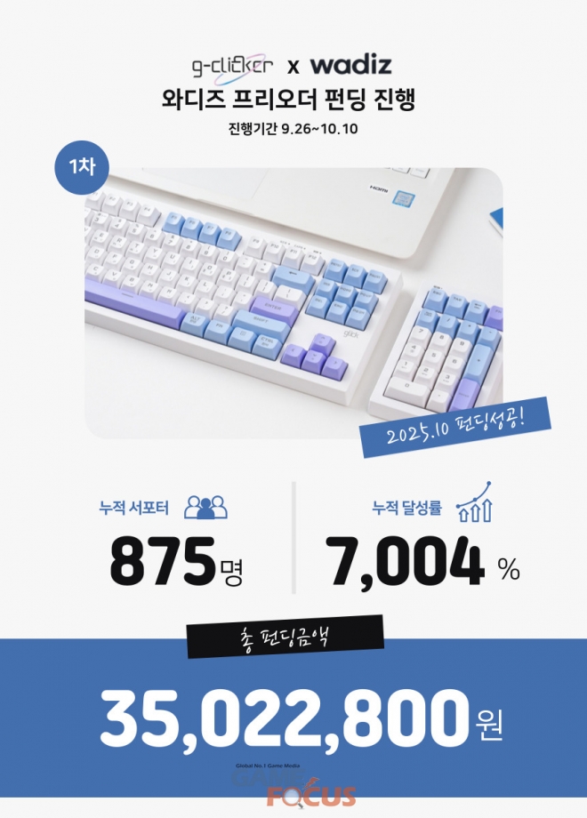 지클릭커는 이 새로운 조합의 소비자 선호도를 확인하기 위해 지난 10월 와디즈 프리오더를 진행한 바 있다. 와디즈의 프리오더는 이미 출시된 제품을 대상으로 서포터에게 구매혜택을 제공하는 신개념 서비스. 제조사는 신제품에 대한 소비자의 선호도를 체크할 수 있으며, 와디즈는 서포터를 위한 혜택을 제공할 수 있어 기업과 와디즈 모두에게 상생이 되는 서비스이다. 지클릭커는 와디즈 프리오더를 통해 진행된 WK87+NK21 프로젝트에서 무려 7005%의 실적을 달성했다고 밝혔다. 아울러 미처 구입하지 못한 서포터들의 재오픈 요청도 이어지고 있는 상황이라고 한다.