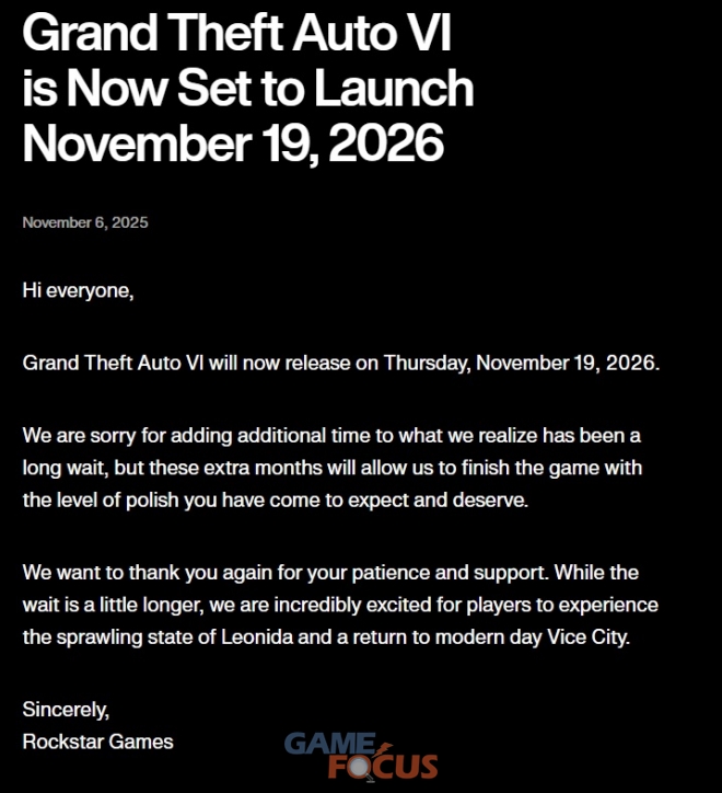 락스타게임즈는 분기 실적 발표를 통해 ‘GTA 6’의 출시일정을 내년 11월 19일로 연기한다고 밝혔다. 공식적인 연기 사유는 완성도. 락스타는 지난번 출시 연기 발표때도 완성도를 이유로 출시일은 늦춘다고 밝혔었고 자신을 관계자라고 밝힌 익명의 제보자들 역시SNS, 커뮤니티를 통해 게임의 개발이 더 필요하다는 의견을 내며 게이머들의 이목을 집중시킨 바 있다.