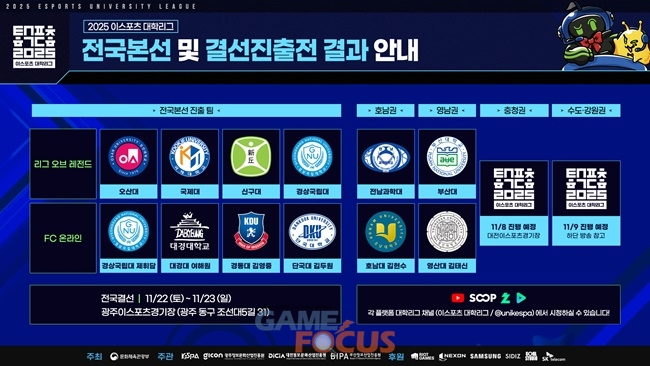 한편 2025 이스포츠 대학리그는 문화체육관광부가 주최하고 한국e스포츠협회와 광주정보문화산업진흥원, 대전정보문화산업진흥원, 부산정보산업진흥원이 공동으로 주관하며, 한국콘텐츠진흥원, 라이엇 게임즈, 넥슨코리아, 삼성전자, 시디즈, 골스튜디오, SK 텔레콤이 후원한다.