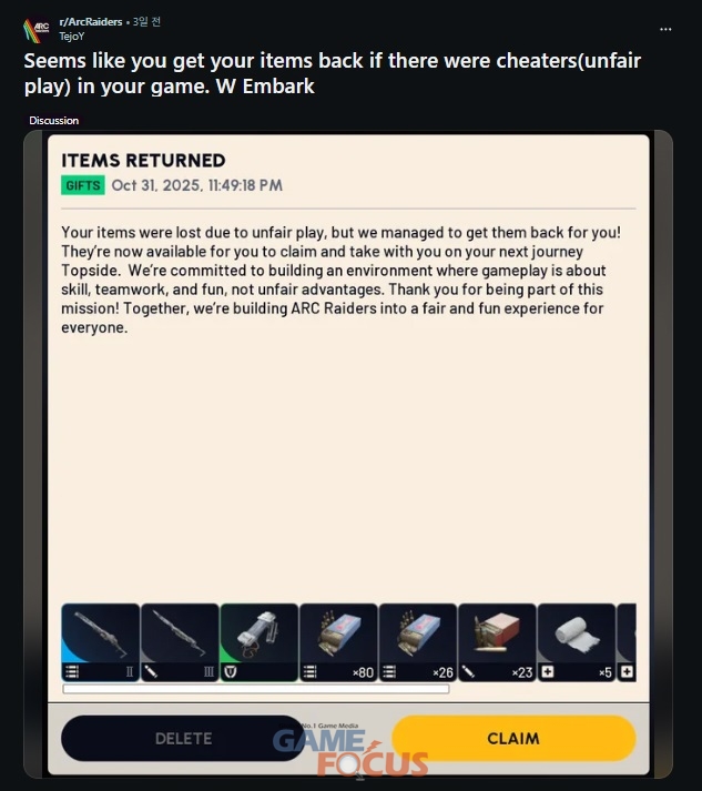 이중에서도 넥슨과 엠바크 스튜디오의 핵 프로그램에 대한 대처와 피해 복구 정책은 이용자들에게 크게 호평을 받고 있다. 최근 해외 커뮤니티 '레딧'에서는 핵 프로그램 이용자에게 사망하고 모았던 아이템을 잃었지만, 이후 운영진에게 잃어버린 아이템을 되돌려 받았다는 사례가 소개되면서 화제를 모았다. 핵 프로그램 이용자의 불공정한 플레이로 인해 아이템을 잃었기 때문에 이를 모두 복구해줬다는 것이다.