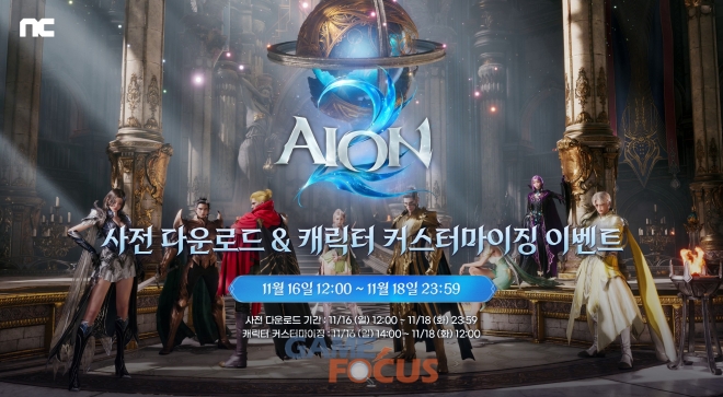 (주)엔씨소프트(공동대표 김택진, 박병무 이하 엔씨(NC))가 11월 16일부터 신작 MMORPG(다중접속역할수행게임) ‘아이온2’의 ‘사전 다운로드 및 캐릭터 커스터마이징 이벤트’를 진행한다고 12일 밝혔다.