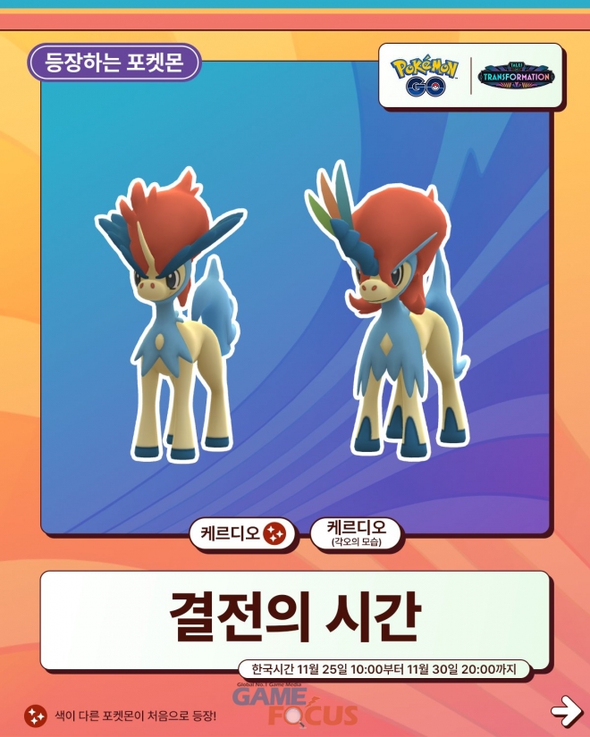 이중 나이언틱은 25일부터 '포켓몬고'의 '변화하는 이야기' 시즌을 마무리하는 '결전의 시간' 이벤트를 진행할 예정이다. '결전의 시간' 이벤트를 통해 망아지포켓몬 '케르디오(각오의 모습)'가 등장하며, 시즌 스페셜리서치 마지막 장에서 '케르디오의 사탕' 50개를 사용해 '케르디오'의 모습을 바꿀 수 있다.