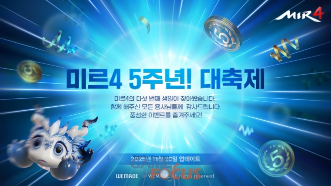 위메이드(대표 박관호)의 MMORPG ‘미르4’가 오늘(20일) 서비스 5주년을 맞이해 대규모 이벤트와 업데이트를 선보였다.