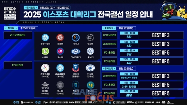 전국결선은 22일 오후 1시부터 LoL과 FC 온라인 종목의 8강 및 4강 경기가 진행되며, 23일 오후 12시부터는 두 종목의 결승전과 3·4위전이 열린다. 공식 생방송은 이스포츠 대학리그 공식 유튜브(youtube.com/@uniKeSPA), 치지직(chzzk.me/KAPCN), SOOP(sooplive.co.kr/unikespa), 네이버 e스포츠(game.naver.com/esports)에서 시청할 수 있으며, 이후 다시보기는 대학리그 유튜브 및 대학리그 다시보기 채널(youtube.com/@uniKeSPA_archive)에서 확인할 수 있다.