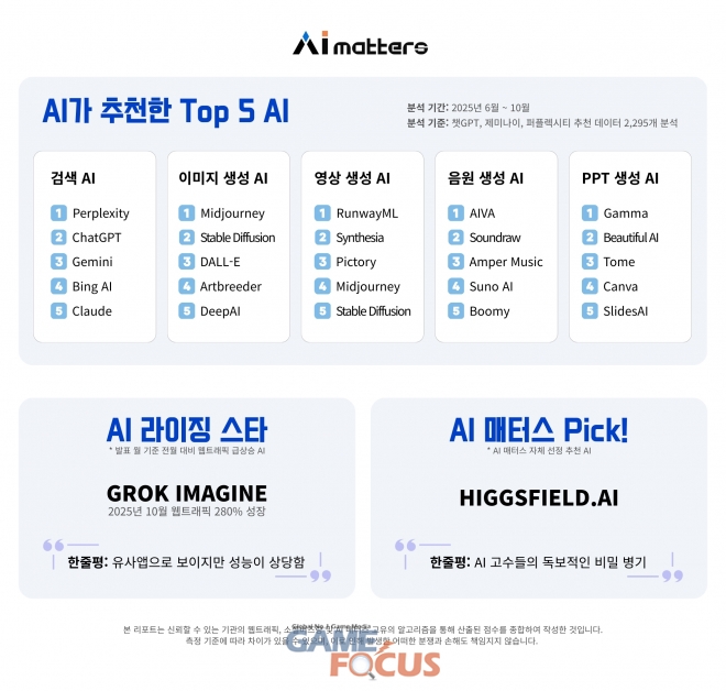 ‘Top 10 AI’ 차트 외에도 AI가 직접 추천한 툴을 정리한 ‘AI 추천 Top 5’ 차트도 함께 공개됐다. AI 매터스는 생성형 AI가 가장 많이 쓰이는 검색, 이미지 생성, 영상 생성, 음원 생성, PPT 생성 등 5개 주요 분야에 대해 생성형 AI가 실제로 추천한 데이터를 분석하고 빈도 기반으로 순위를 선정했다. 그 결과 검색 분야에서는 챗GPT, 이미지 생성에서는 미드저니, 영상 생성은 런웨이, 음원 생성은 수노, 프레젠테이션 생성 분야에서는 감마가 각각 1위를 차지했다.
