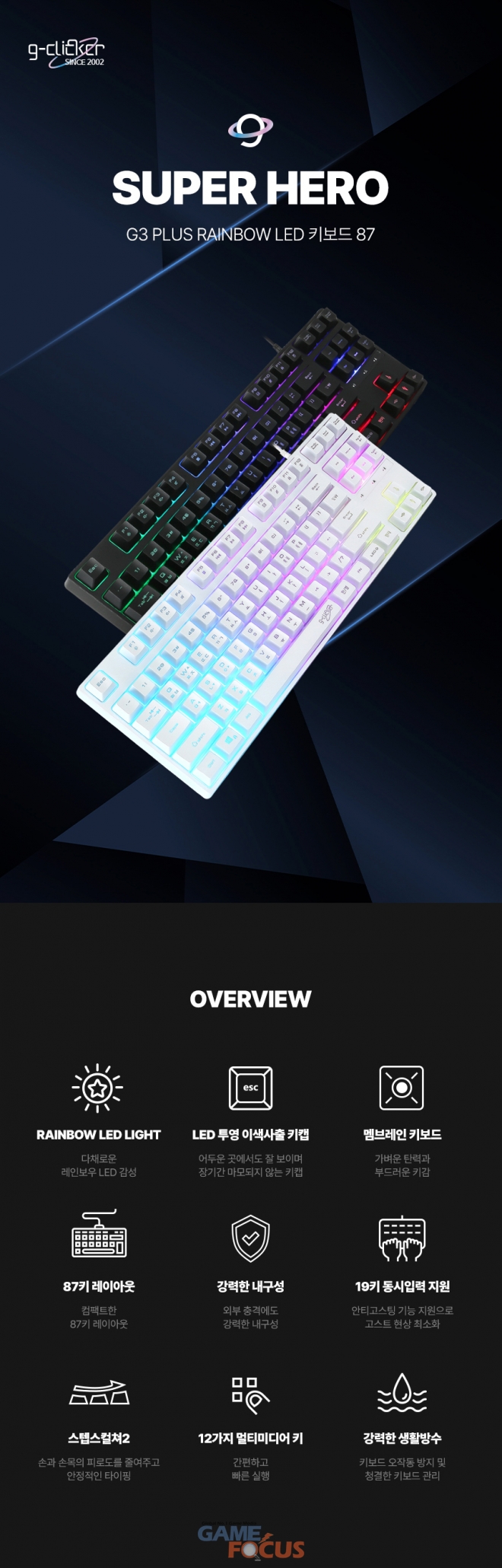 지클릭커(g-clicker)는 조용한 게이밍 환경을 원하는 소비자를 위해 멤브레인 스위치를 탑재하고, 87키 레이아웃과 슬림한 하우징을 적용해 탁월한 공간 활용도와 스타일을 연출한 게이밍 키보드 ‘지클릭커 슈퍼히어로 G3 Plus 87키 레인보우 LED 게이밍 키보드(이하 G3 Plus)’를 출시한다고 밝혔다.