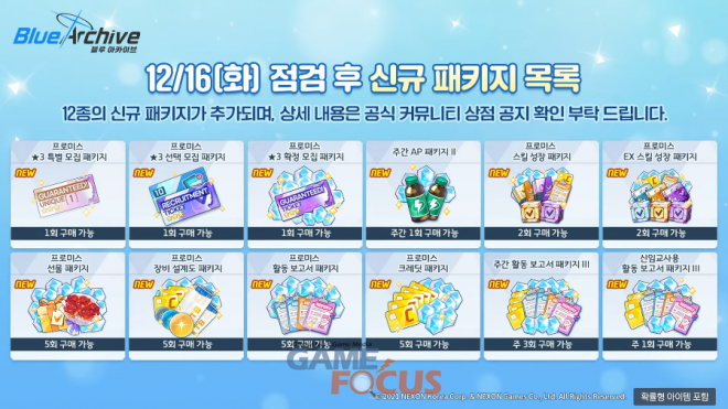 12월 16일 점검 이후에는 12종의 신규 패키지도 추가된다. 이중에서도 3성 선택 모집 패키지는 그동안 없어서 아쉬웠던 학생을 데려올 수 있는 절호의 기회로, 많은 '선생님'들이 구매할 것으로 예상된다. 이와 함께 다양한 보상과 특별 가구 및 칭호 그리고 청휘석까지 얻을 수 있는 '배틀패스' 상품이 추가된다. 더불어 PC '스팀' 클라이언트에서만 구매 가능한 패키지 3종도 출시된다.