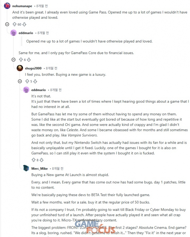 실제로 레딧 등 글로벌 주요 커뮤니티에서도 하나의 게임을 구매할 가격이면 구독 기반 게임 서비스 1~4개월을 이용할 수 있는 만큼 연간 1~2개 정도의 게임을 구매하는 유저가 아니라면 가성비 측면에서 구독 서비스를 이용하는 것이 이익이라는 반응이 대세를 이루고 있다. 게임 소유 그 자체에 목적이 있는 것이 아니라면 짧은 기간동안 구독 서비스를 활성화 하고 충분히 자신이 즐기고자 하는 게임을 즐긴 이후에 구독 해지를 하는 것만으로도 금전적인 부담을 크게 줄여줄 수 있다고 평가하며 구독 기반 서비스가 가진 장점을 높이 평가했다.