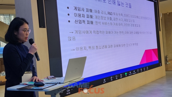 한국게임미디어협회와 한국게임정책자율기구가 개최한 ‘게임 불법 사설 서버 피해와 대책’을 주재로 한 세미나에서 서울시립대학교의 손혜림 교수가 불법 사설 서버로 인해 게임사들과 이용자들이 입는 피해에 대해 설명하고 그 심각성에 대해 경고했다.
