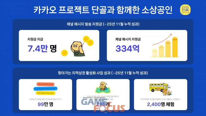 카카오는 소상공인의 고객 소통을 지원하기 위해 ‘톡채널 메시지 발송 지원’ 프로그램도 운영하고 있다. 올해 지급된 지원금은 70억 원을 넘었으며, 누적 지원금은 334억 원에 달한다. 현재까지 총 7만 4천여 명의 소상공인이 혜택을 받았으며, 연 매출 10억 원 이하 소상공인이라면 ‘카카오 프로젝트 단골’ 공식 톡채널을 통해 상시 신청 가능하다.