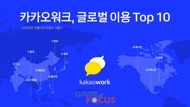 카카오워크의 성장세는 ▲해외 이용량 증가 ▲다양한 업무환경에서도 안전한 정보보안 기술 ▲고객 요구를 적극 반영한 서비스 업데이트가 맞물려 시너지를 낸 결과로 분석된다. 특히, 지난해 38개국이었던 카카오워크 해외 이용 국가는 올해 10월 기준 80개국으로 대폭 늘어나며 최대치를 갱신했다. 주요 해외 이용국가는 미국, 필리핀, 싱가포르, 일본 순으로 나타났다.